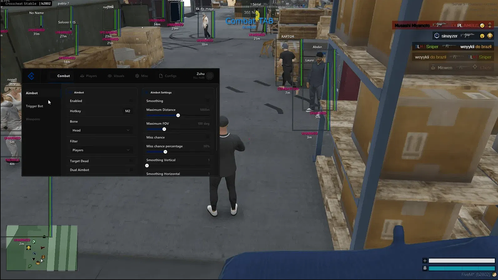 Aimbot Take full control of your accuracy with the customizable aimbot. Adjust the range, sensitivity, and target settings to perfectly match your playstyle. Every shot is sharp and precise, giving you a decisive edge in every battle. ESP for Tactical Awareness Gain tactical superiority with ESP. Spot enemies, loot, and other key elements through walls, helping you plan your movements carefully and dominate your opponents. No-Clip Mode for Freedom Unlock limitless exploration with No-Clip mode. Move freely through the map, bypass obstacles, and escape tricky situations with ease. Explore every corner of the game world without restrictions. Fully Customizable and Secure Tailor the Sapphire, exclusively designed by Crosscheat, menu to your needs. From aimbot sensitivity to visual tweaks, adjust everything your way. Sapphire is also secure, featuring strong anti-detection systems and regular updates to stay compatible with the latest FiveM server changes.